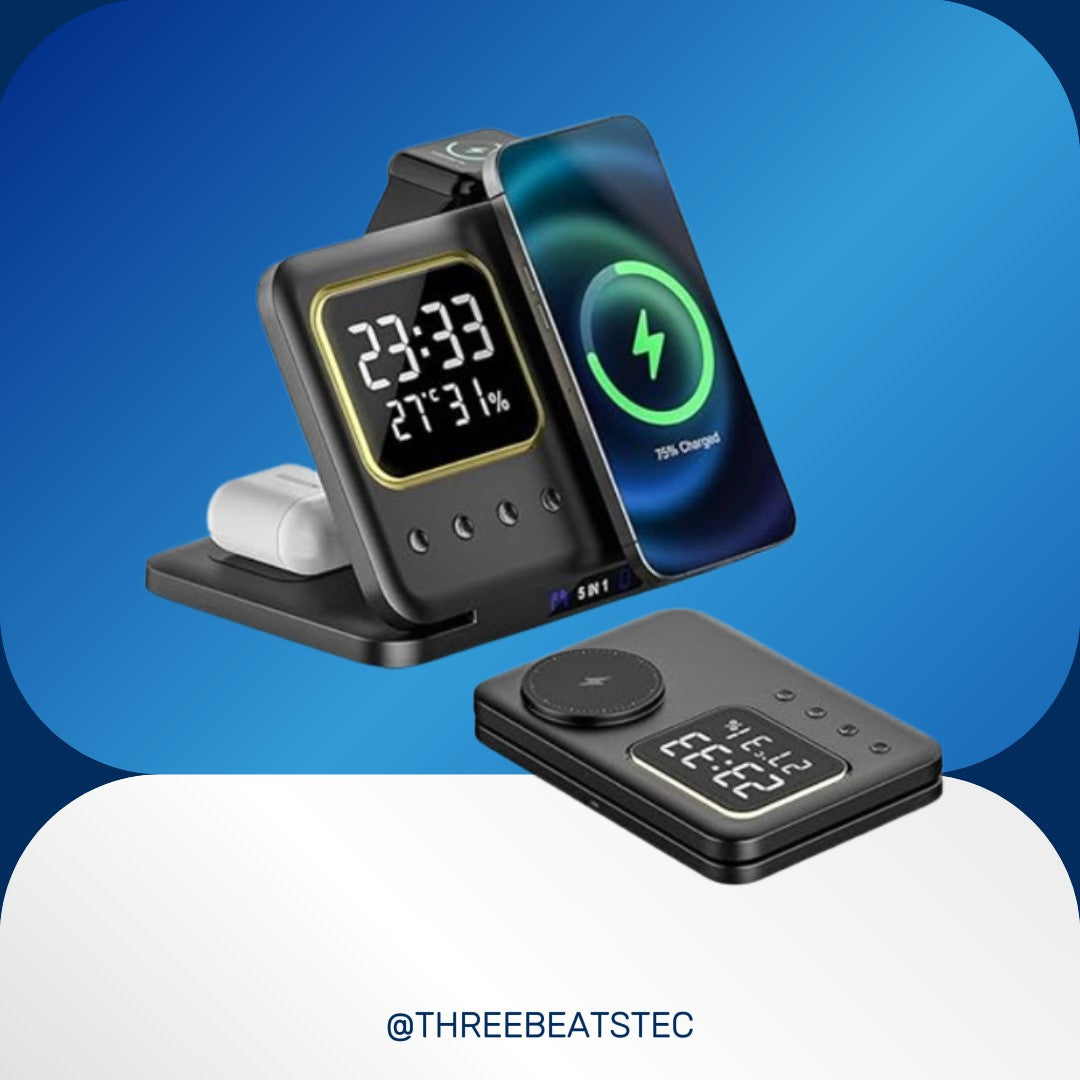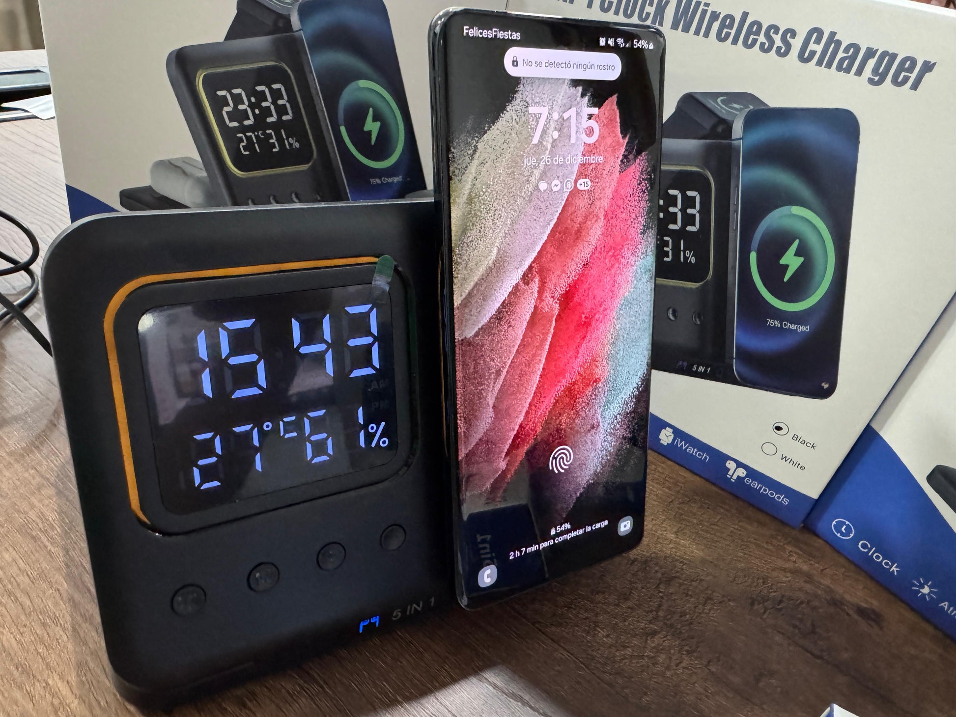 Ofrece potencia máxima de 15W para teléfonos📱, 5W para audífonos🎧 y 2.5W para el reloj, ⌚cargando eficientemente mediante inducción electromagnética. Cuenta con puerto de entrada tipo C para una conexión universal. Incluye cargador, cable Tipo-C🔌, manual, soporte universal y adaptador, brindando una solución completa para mantener tus dispositivos cargados y el tiempo bajo control.