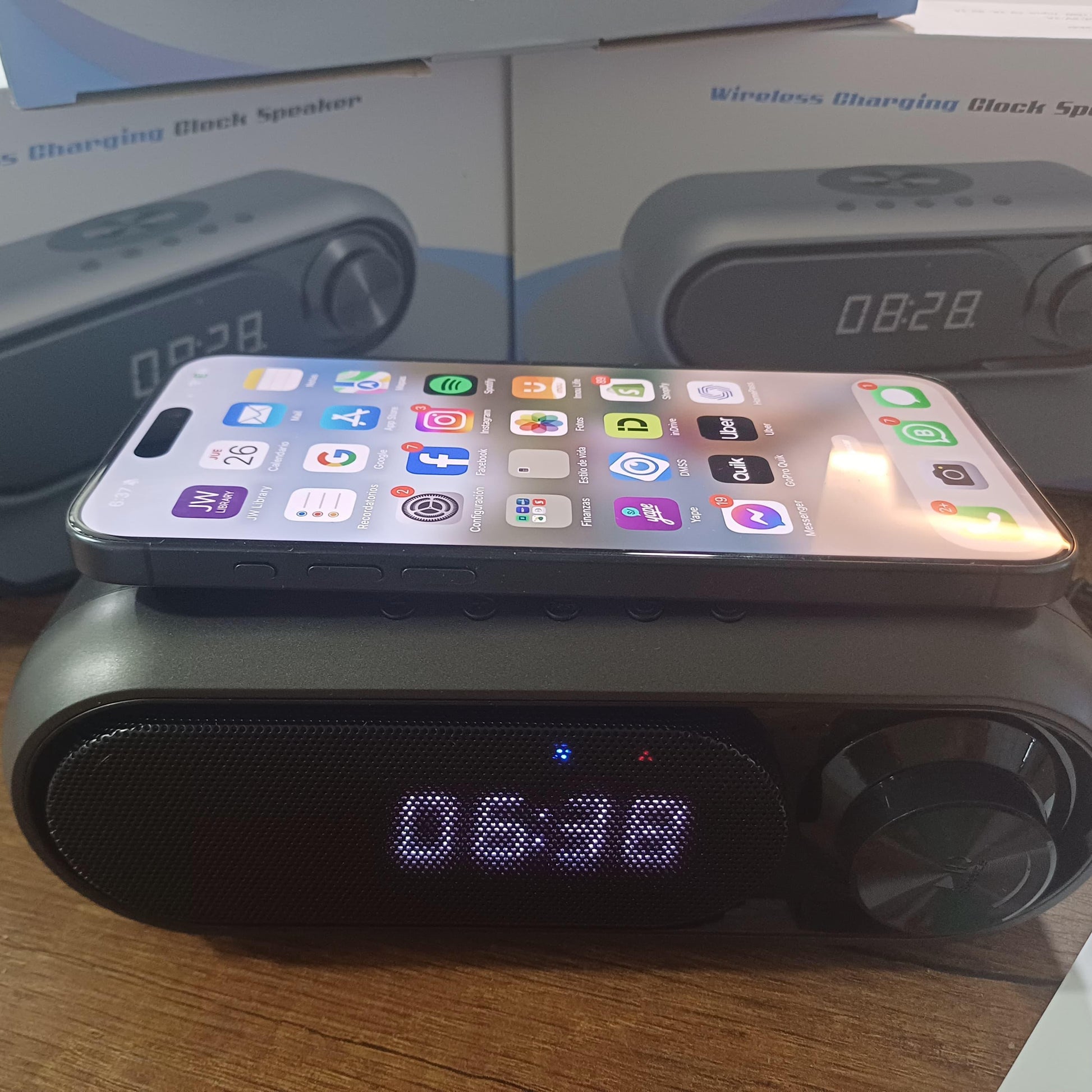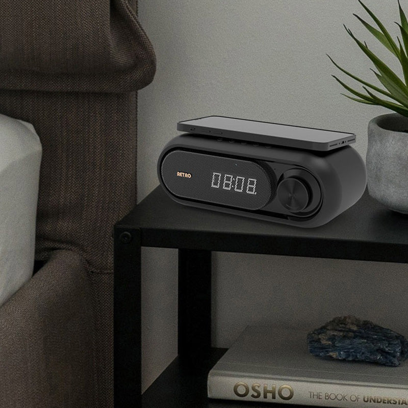 Integra carga inalámbrica rápida compatible con múltiples dispositivos, eliminando la necesidad de cables⚡. Su funcionalidad 4 en 1 combina altavoz, cargador inalámbrico, reloj despertador y radio FM/reproductor MP3, optimizando espacio y utilidad.📻